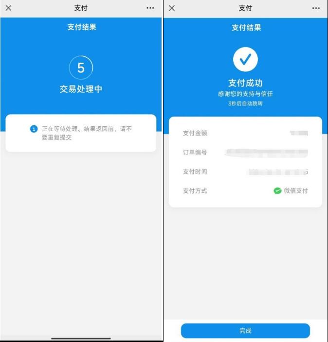 6.选择微信后,点击下方确认支付按钮,输入支付密码进行支付,等待支付结果,成功后自动显示支付成功界面。