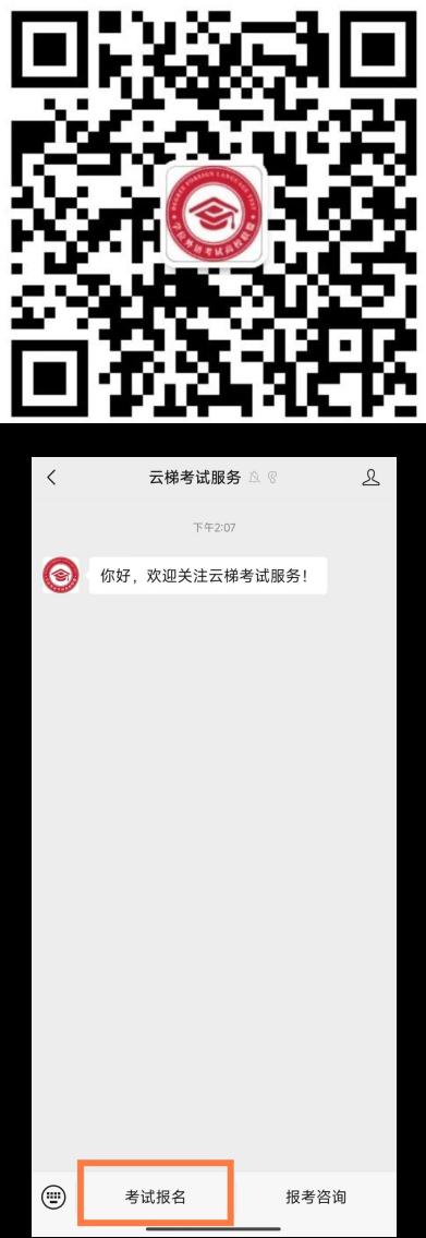 1.学生微信需关注北京网梯学位外语考试服务公众号,进入对话界面,下方点击考试报名: