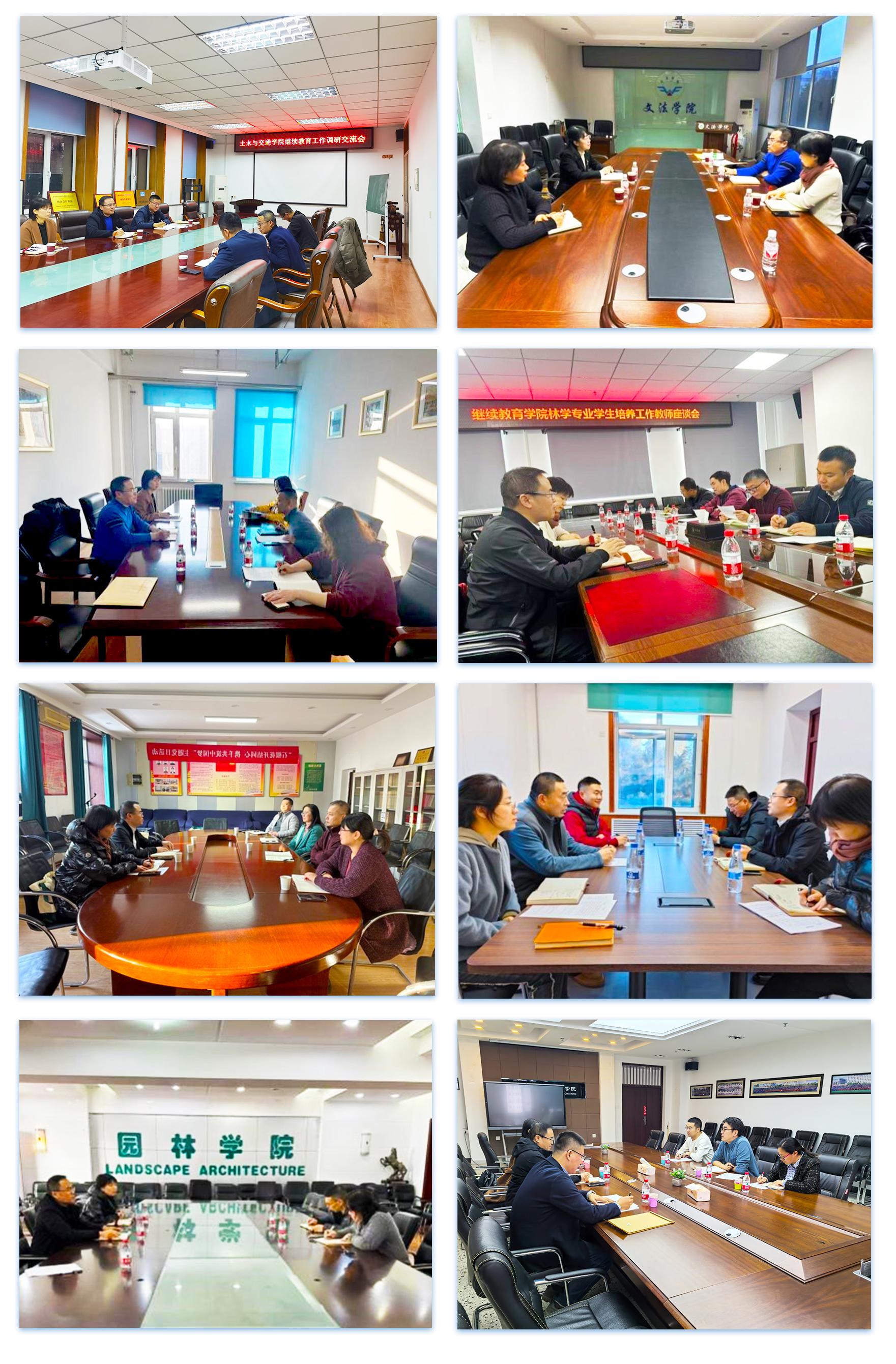 继续教育学院院长李国梁、副院长葛冰带队,先后深入林学院、园林学院、文法学院、经济管理学院、土木与交通学院、计算机与控制工程学院、野生动物与自然保护地学院等七个学院进行调研交流。各学院相关领导、专业负责人以及教师代表纷纷参与到座谈交流之中,形成了积极互动、广泛参与的良好氛围。