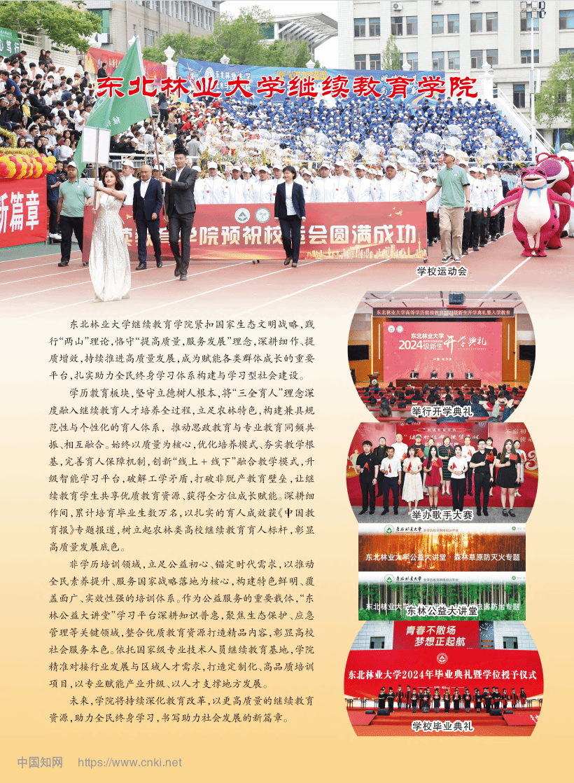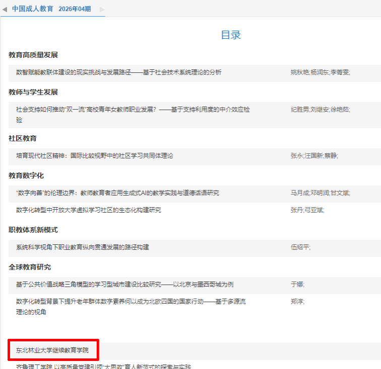 本期发表的专题报道,全面回顾了近年来东北林业大学继续教育学院在学历继续教育改革、非学历教育品牌打造以及服务国家生态文明战略等方面的创新实践与显著成效。此次在《中国成人教育》上的刊发,不仅是对学院过往工作,特别是对学院将“三全育人”理念深度融入继续教育人才培养全过程,始终以质量为核心,优化培养模式、夯实教学根基,完善育人保障机制,创新“线上+线下”融合教学模式的集中展示,更是对学院在新的发展阶段,致力于构建高质量继续教育体系、探索“东林案例”的一种认可。