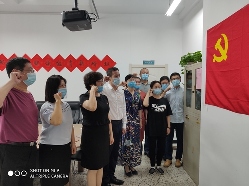 继续教育学院全体党员佩戴党徽,站在党旗面前庄严宣誓,重温了入党誓词,然后全体党员与党旗合影留念。党员们在党旗下说出对党的心里话,大家表示:中国共产党从建党成立起,带领中国人民经过长期艰苦卓绝的努力、百折不挠,终于使我们的国家从站起来、富起来到强起来,扬眉吐气屹立在世界的东方。实践又一次证明,我们中国共产党是伟大光荣正确的党,她代表中国最广大人名人民的根本利益。在这史无前例的疫情面前,我们深刻感受到中国共产党的伟大,党和国家的力量,更加牢固树立“四个意识”,坚定“四个自信”,坚决做到“两个维护”。作为党员,我们一定要不忘初心,牢记使命,全心全意为人民服务,为党的事业尽自己一份微薄之力,为了学校继续教育发展做出应有的贡献。