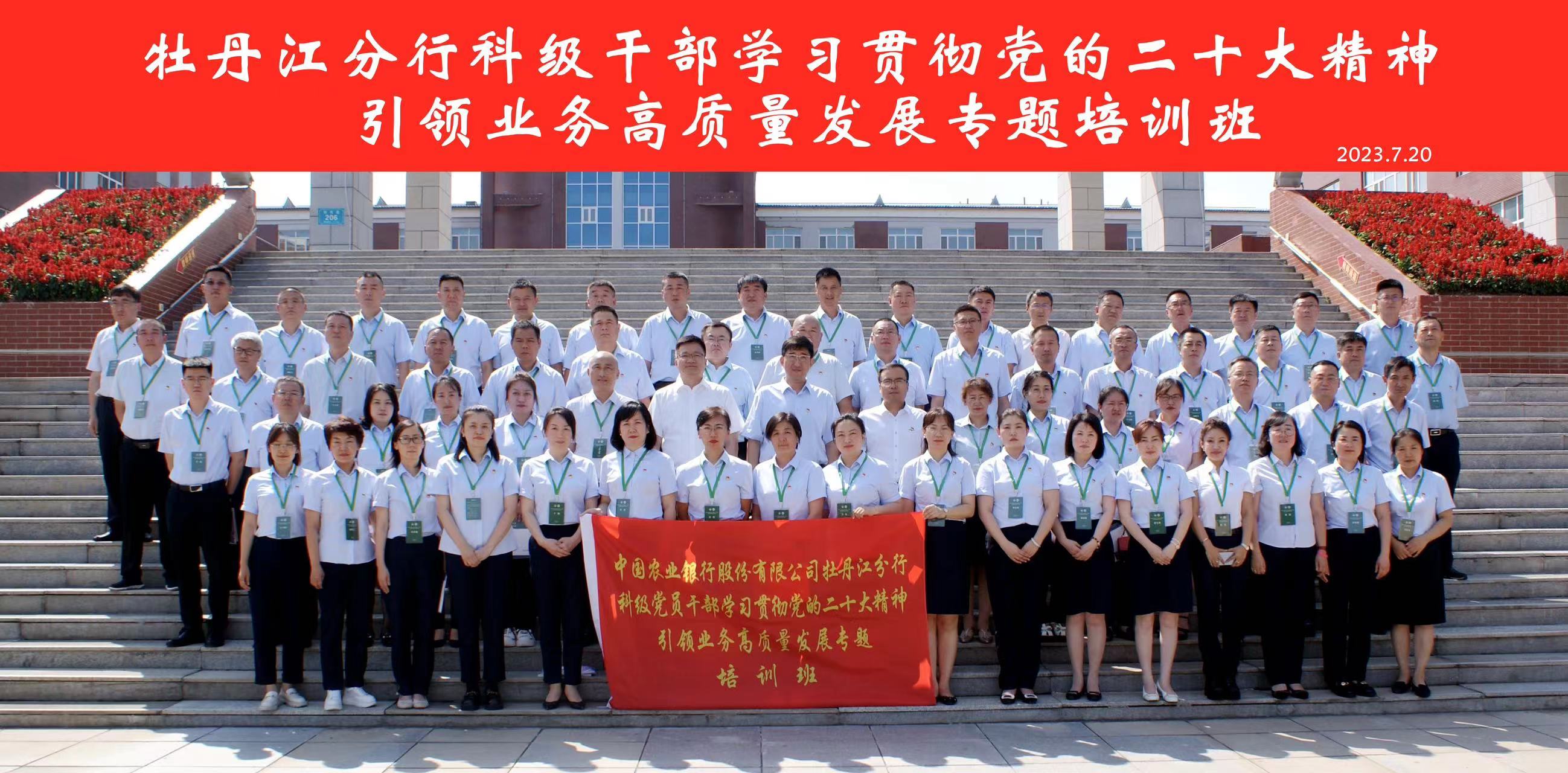 7月20日下午,由继续教育学院主办的中国农业银行股份有限公司牡丹江分行科级党员干部学习贯彻党的二十大精神,引领业务高质量发展专题培训班在中共海林市委党校开班。东北林业大学马克思主义学院党委书记苏志刚,东北林业大学继续教育学院院长兼直属党支部书记李国梁,牡丹江分行党委书记、行长王瑞及培训班全体学员出席开班式,开班式由继续教育学院副院长田智主持。
