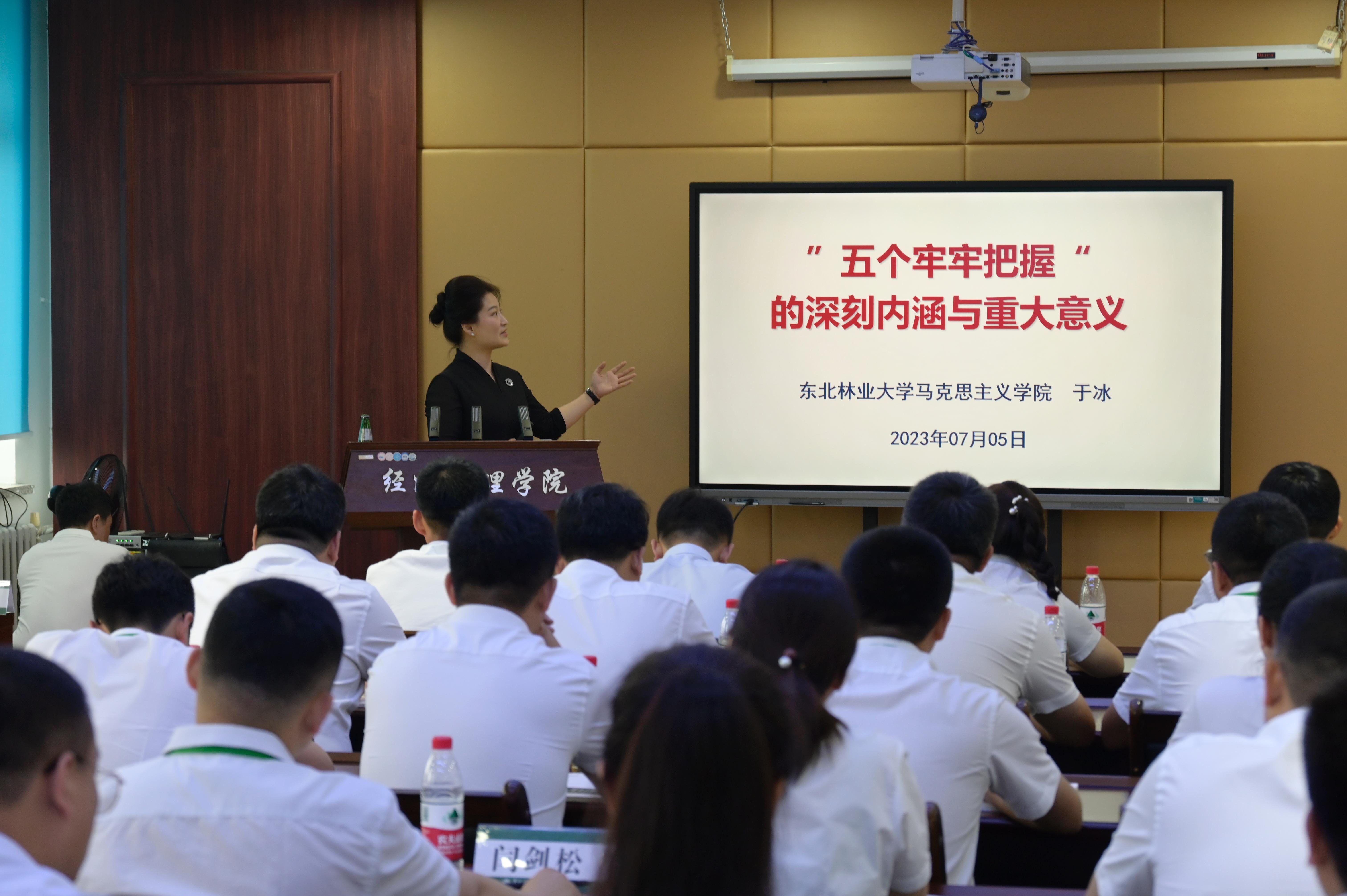 培训班开班第一课由马克思主义学院院长于冰教授以《五个牢牢把握的深刻内涵与重大意义》为讲授题目,从“大会的主题”“五个牢牢把握的重点内容、重要意义”等方面进行了系统宣讲和科学阐释,为伊春森工集团年轻干部能力素质提升培训班深入学习领会党的二十大精神作了一次精彩的政治理论辅导。