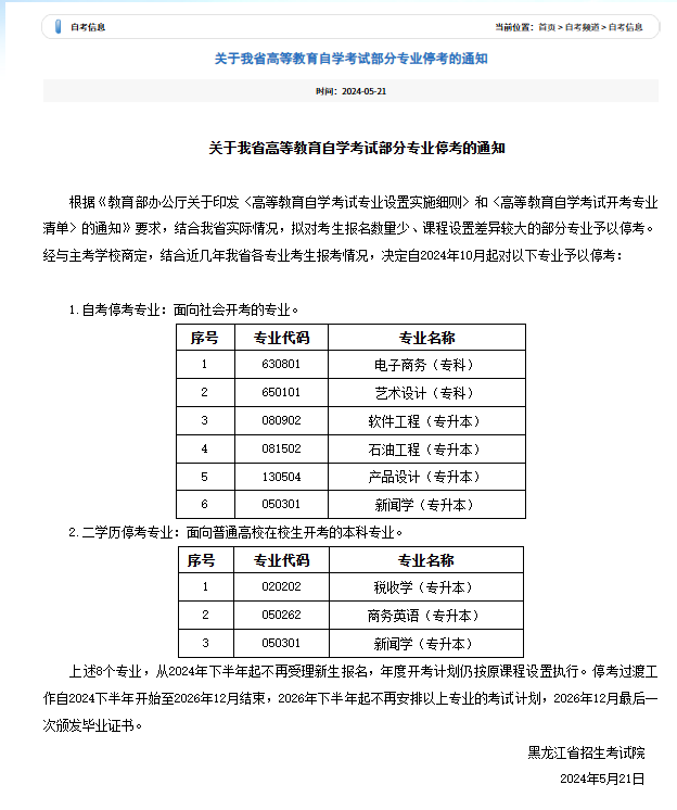 黑龙江招生考试院发布的《关于我省高等教育自学考试部分专业停考的通知》原文如下:https://www.lzk.hl.cn/zk/zkxx/202405/t20240521_19012.htm
